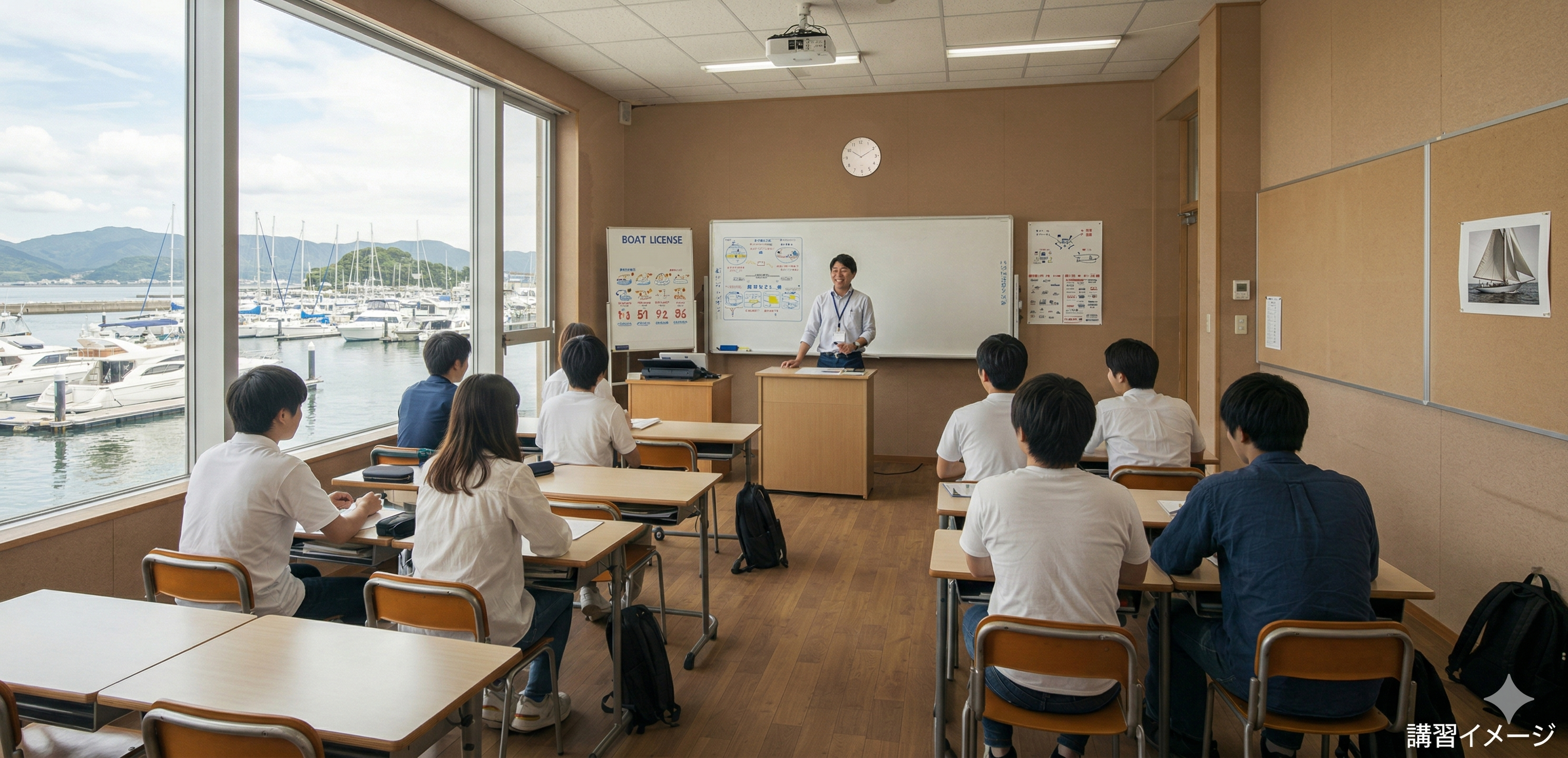 ボート免許教室が実施する学科講習(自宅学習も可)と実技講習を受講後に国家試験(学科試験と実技試験)を受験し合格することで免許を取得します。講習・試験とも同会場で行います。 |